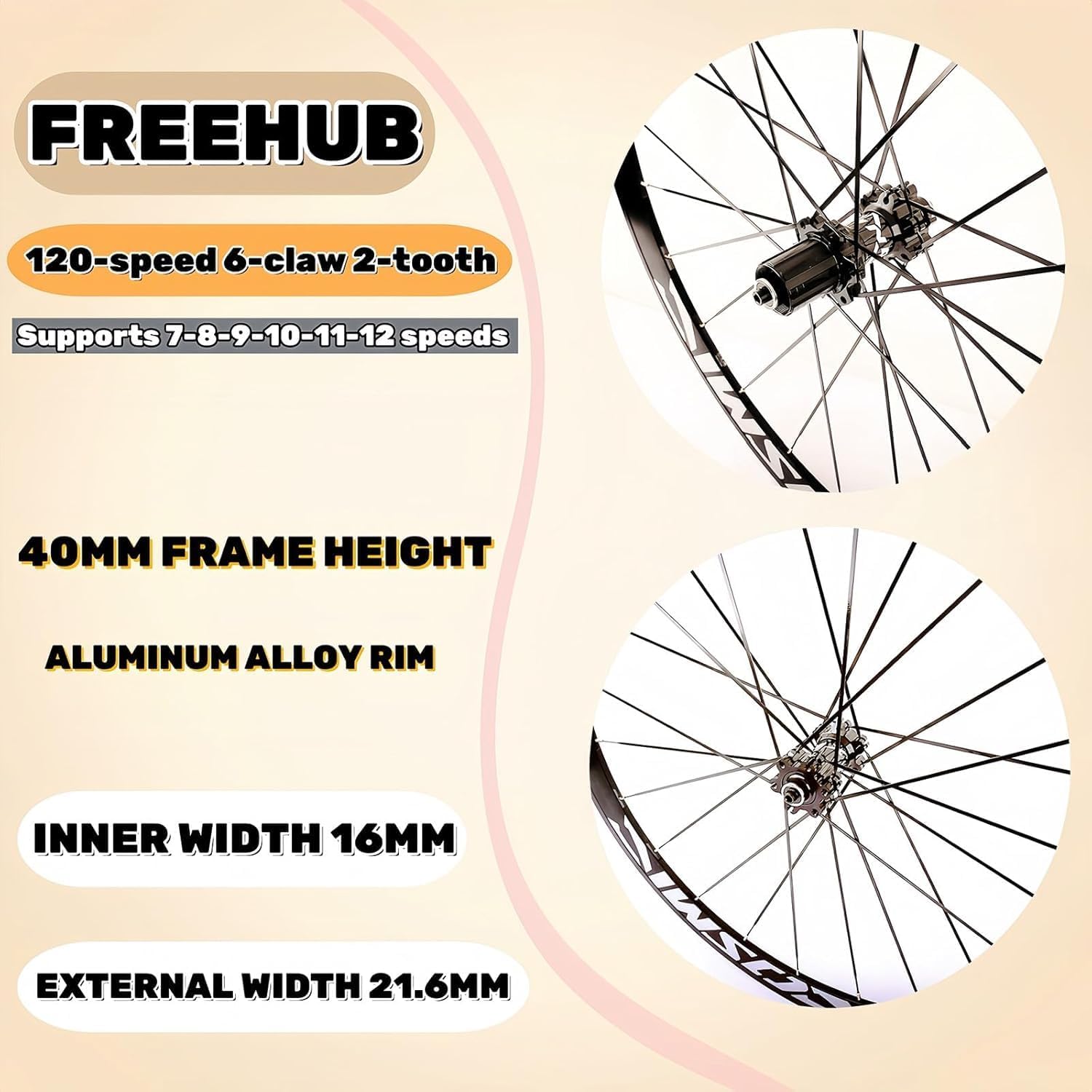 Product features40MM/50MM frame height aluminum rim, outer width 21.6mm, inner width 16mmSize: supports outer tires 23C-25C-28C 32C 35C, inner tube mouth, 40 frame height uses 48L or 60L, 50 frame height uses 60L or 80LCoasting: Aluminum coasting, HG coasting supports Cavi 7-8-9-10-11-12-speed.Spokes: Straight Pull Windbreaker (flat spokes) Xieda spoke capsNumber of holes: V-brake front 20 holes and rear 20 holes, disc brake front and rear 24 holes(Open) V-brake front 100 and rear 130. Disc brake quick release front 100 and rear 135MM. Disc brake barrel axle front 100X12MM rear 142X12MM.Weight: 40MM pair 1950G 50MM pair 2300GAccessories:A pair of running wheelsA pair of quick-release fastenersTwo high-pressure tire coversA sealCustomer service: