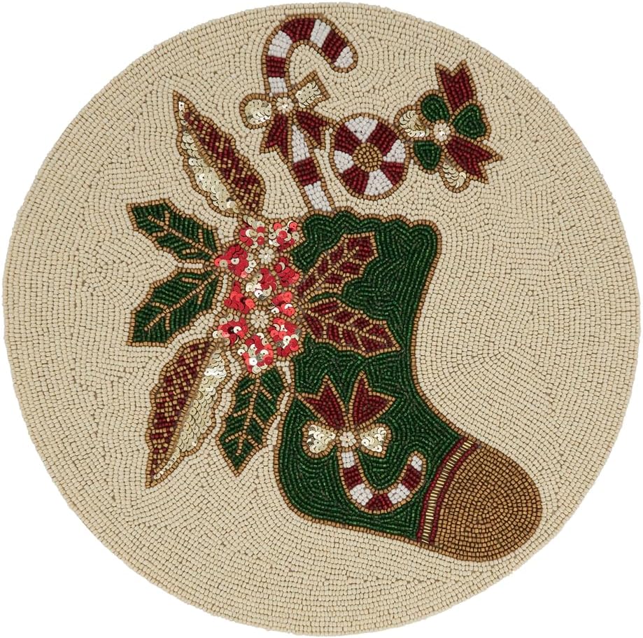 Fennco Style Hand Beaded Christmas Stocking Holiday Placemat, 1-Piece:Add a festive touch to your tabletop with this gorgeous Hand Beaded Christmas Placemat. Featuring a holiday stocking design adorned with candy cane and holly, the rich colors and texture come together in the exquisite design with glass beads that add a sparkly note to the tabletop. This chic piece will add a glam touch to your tabletop, with its festive patterns and vivid colors. They coordinate easily with other holiday tableware or solid dinnerware.PRODUCT DETAILS :Dimensions: 15x15 inches roundMaterial: glass beads, fabric, cardboard Care Instructions: wipe with damp clothOur Philosophy:At Fennco Styles you can shop a carefully selected range of home, lifestyle and gift products. We believe our homes should be reflections of the journeys we take. Our personal spaces deserve designs with a soul, a story, and a purpose. Our lifestyle brand offers inspired living through high-quality products, exclusive designs, and timeless style. We aim to source ethically, looking for products that are made from sustainable materials and designed to last and seeking out Makers that are conscious of their impact on the environment.