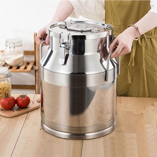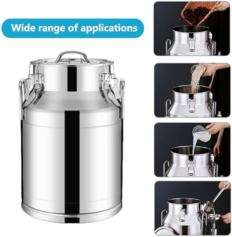 The milk bucket is made of food-grade 304 stainless steel material, which is durable, rust-proof and heat-resistant. Our seal barrels with three clips and silicone seal can provide you with quality and flavor preservation. The lid of the milk can has a waterproof rubber seal to effectively prevent liquid from spilling, food is less likely to spoil or become tasteless. This storage barrel are suitable for storing various wet and dry foods, such asrice, flour, grain, dried peppers, oil, milk, wine, water, etc.Specification:Size: 28L(30*40cm),35L(30*50cm),48L(35*50cm),64L(35*70cm),76L(40*60cm)Can Material: 304 Stainless SteelLid Gasket Material: SiliconeShape: RoundColor: SilverPackage Content:1 x Milk can