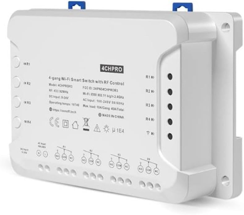Features:* and *Made of materials, *3 working modes, which can directly enter the self-locking, interlocking and inching modes on the APP.*Run 4 Devices Separately] Allows you to turn 4 connected lights on or off independently.*Automatic multiple devices, 1 channel controls working state, 1 channel can be opened by interlocking, and other channels can be closed at the same time.*Auto shut off Don't want to fumble around stiffly in the dark? Enabling jog mode allows you to set an "on" schedule for the hallway light, after which it will automatically turn off.*Voice control your home, compatible with for Smart home.*Easy-to-reach equipment, mounted on rails for easy connection and control of equipment far away from the switch.*Safe to use, flame retardant PC housing provides maximum for connected devices in use.